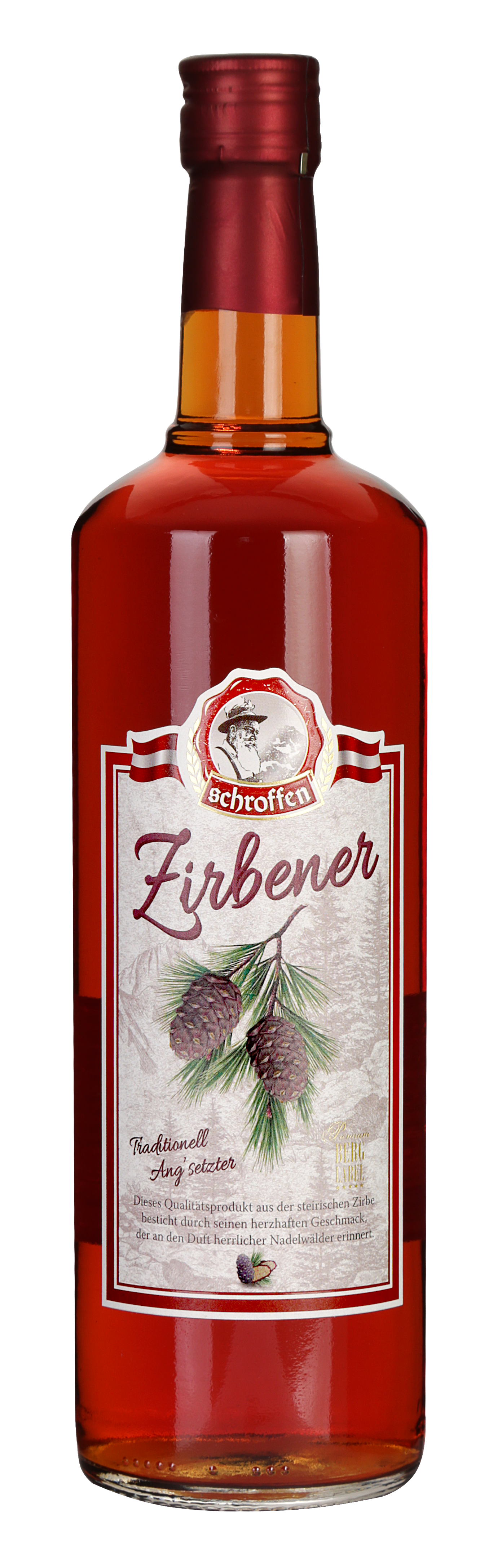 Der Schroffen Zirbener ist ein Qualitätsprodukt, das aus der steirischen Zirbelkiefer gewonnen wird. Diese seltene Kieferart wächst in Höhenlagen ab 1.500 Metern und ihre Zapfen werden mühsam von Hand geerntet. Im Frühsommer, wenn die Zirbenzapfen ihren optimalen Reifegrad erreicht haben, werden sie gehackt und einige Wochen in Obstler mazeriert. Dieser Prozess verleiht dem Schnaps seinen unverwechselbaren und reinen Zirbengeschmack.